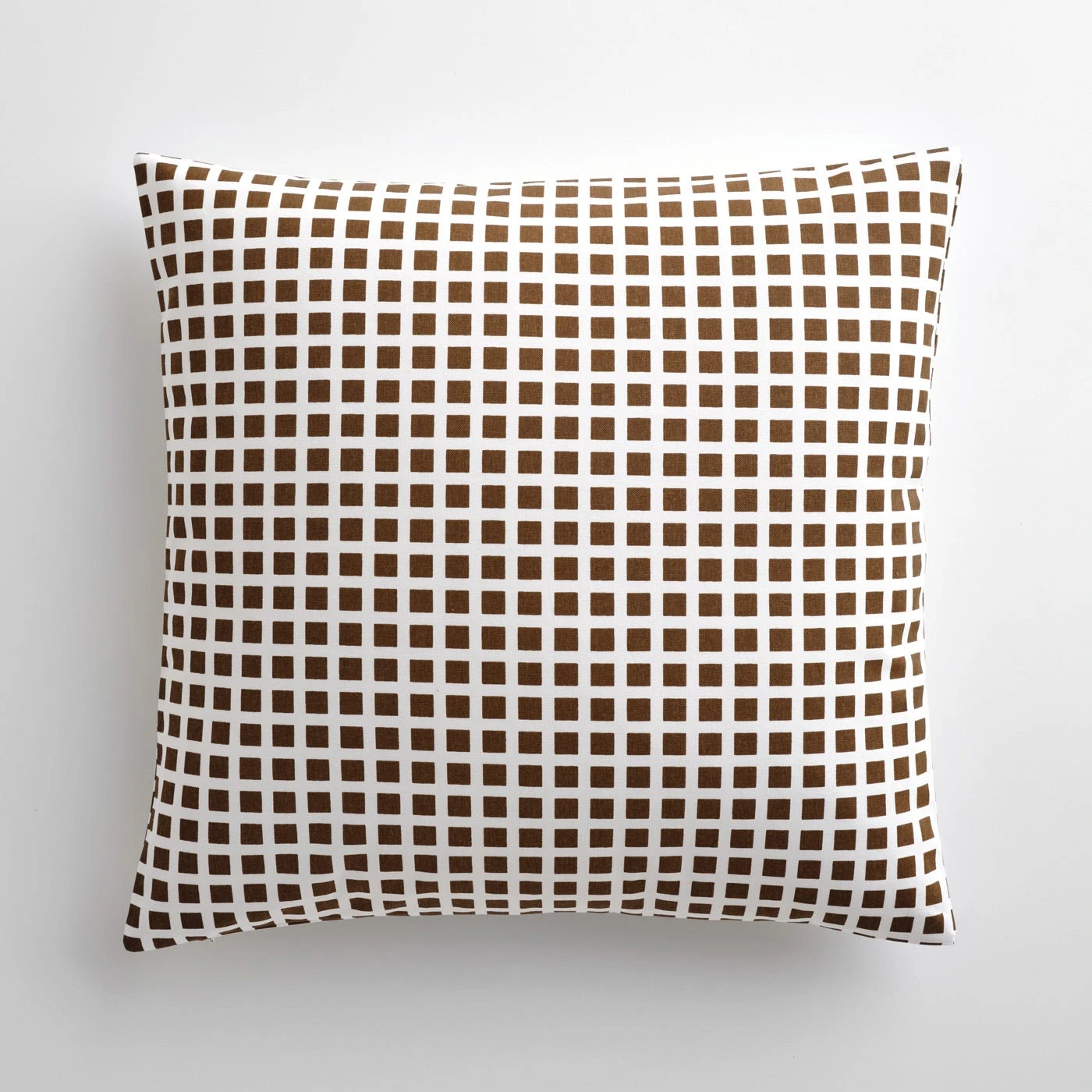 With its gridded, geometric print, the Tiles Bark Throw Pillow Cover adds an eye-catching accent to a sofa, chair or bed. Set against a bright white background of 100% cotton sailcloth, the warm, medium brown squares create a bold contrast. The fabric is screen-printed by hand in a family-owned textile mill in operation since 1937, one of the few of its kind remaining in the U.S. Then, one of our local sewing companies finishes the design with a hidden zipper. The Unison-exclusive print has a timeless, classic appeal which makes this large statement pillow cover a beautiful decorative accent in the home.