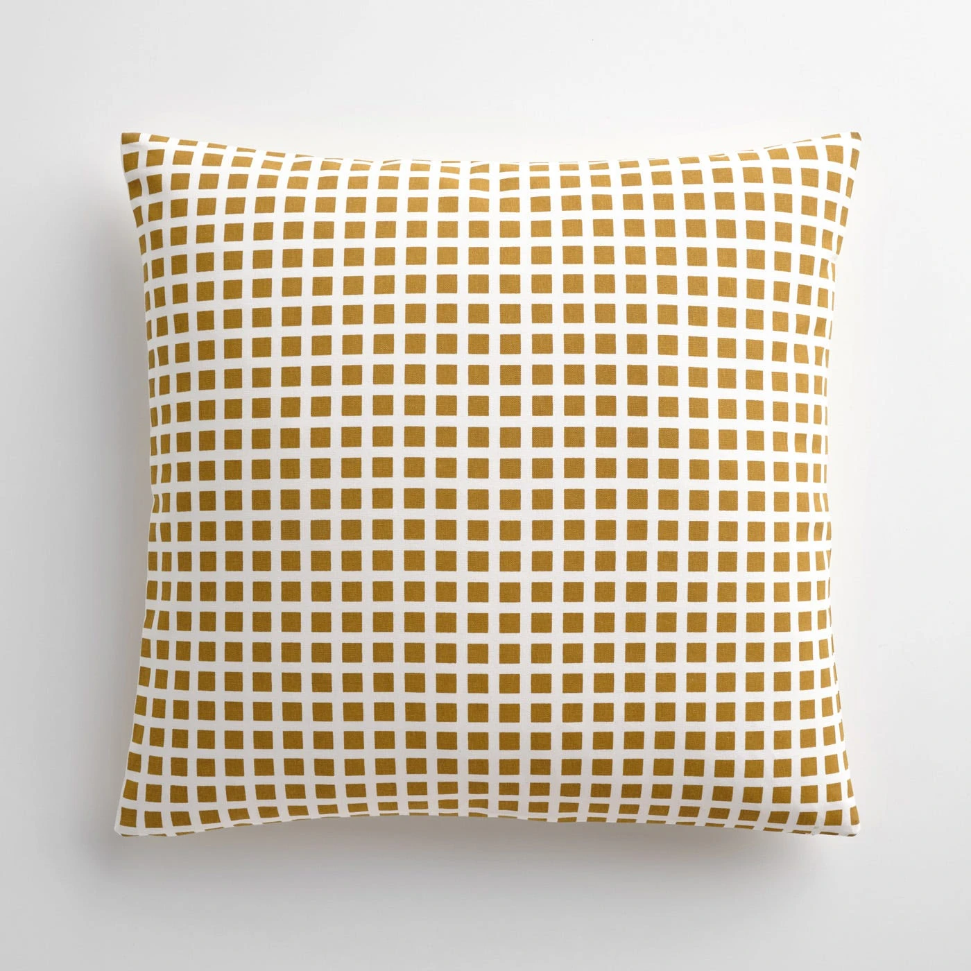 A simple geometric pattern combined with a captivating color makes the Tiles Yarrow Throw Pillow Cover a timeless decorative accent. This Unison-exclusive print features a grid of repeating squares set against a bright white cotton sailcloth background. Each of the squares is saturated with a deep golden yellow hue, adding a colorful accent to a sofa, chair or bed. The fabric is hand screen-printed by a family-owned textile mill which has been operating since 1937, one of the few remaining fabric mills of its kind in the U.S. A local sewing business then finishes each square statement pillow cover with a hidden zipper.