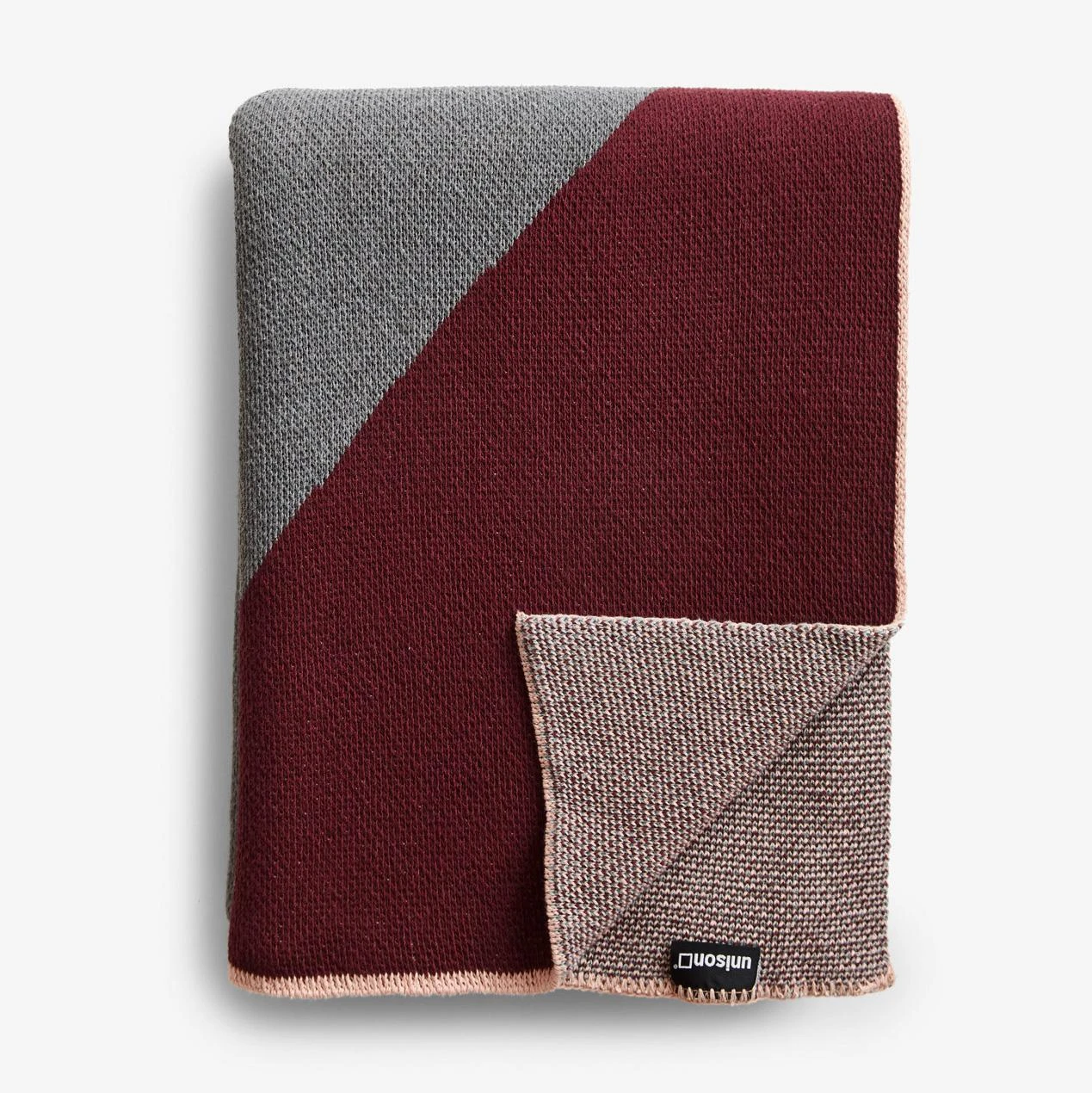 Featuring a striking pattern and color combination of light pink, burgundy and two-tones of gray, this recycled cotton and polyester blanket makes for a warm addition to any interior. Drape it across the arm of a sofa, or lay it out at the foot of the bed, this graphic double-knit throw has a sweater like texture that is both weighty and warm. Designed by Chicago-based artist Chad Kouri as a Unison exclusive, and produced by a fourth-generation family owned manufacturer, this throw blanket is both designed and manufactured in the USA.