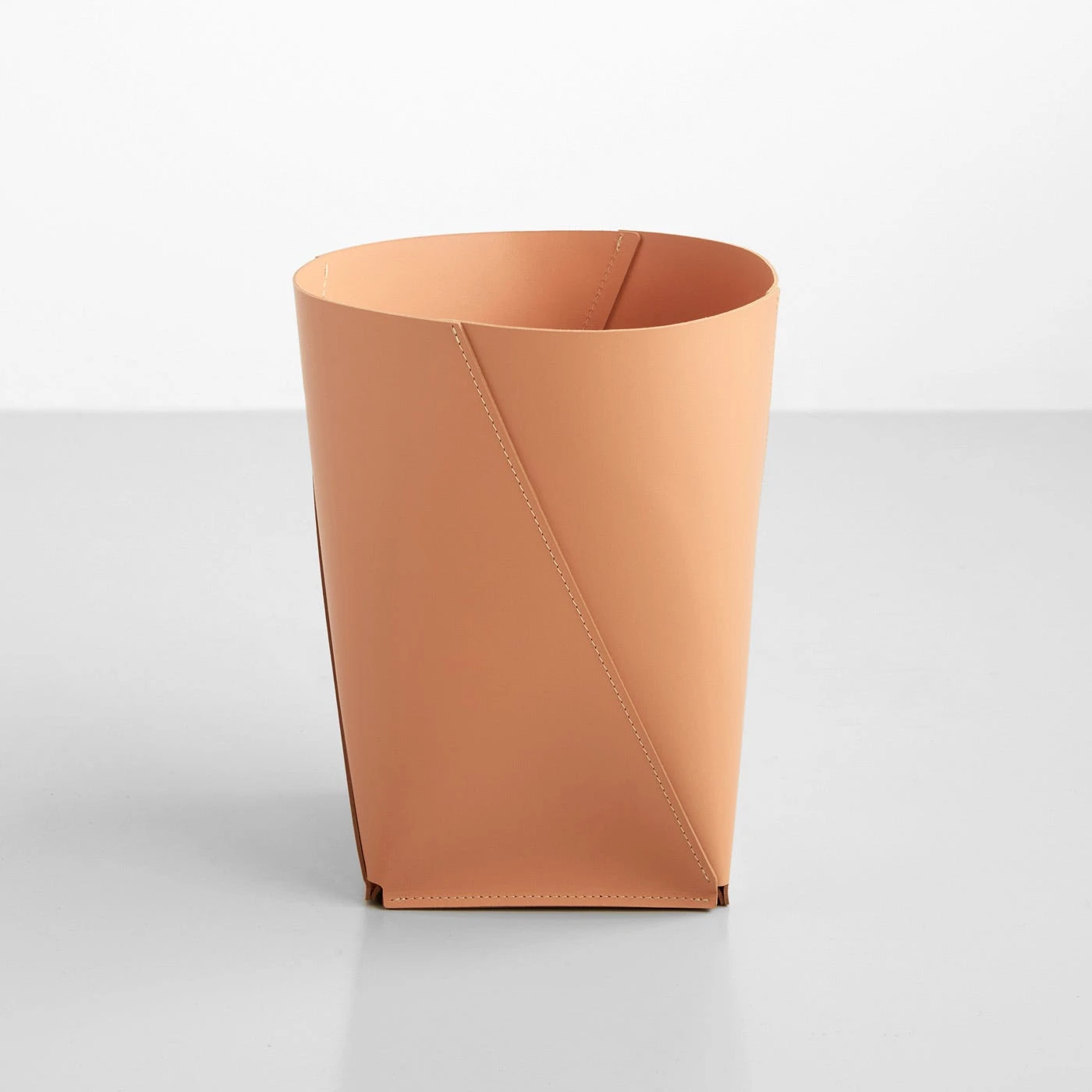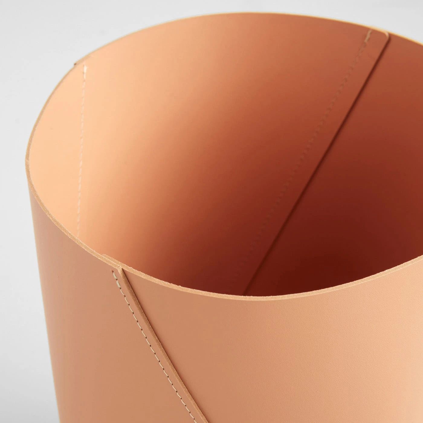 The Twist Clay Leather Waste Bin fulfills a practical household need while maintaining a refined look in your home. Crafted in Spain, each bin is made using discarded scraps from the leather industry. Those scraps are seamlessly bonded together to form recycled leather which is beautiful, sustainable and durable. The smooth, pliable leather is shaped into a cylinder which tapers down slightly toward the bottom. Twisting seams with contrasting stitching underscore the handmade look and feel. This tan leather bin features a warm, neutral tone fitting for most bedrooms, bathrooms and home offices.
