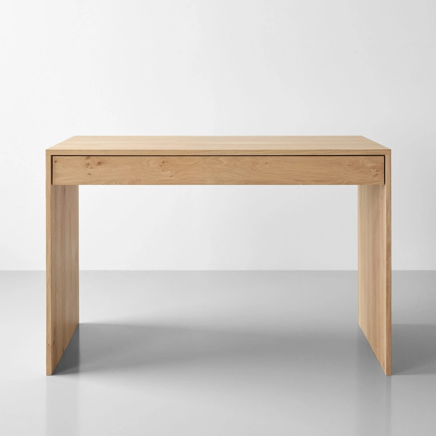 Clean and simple, this compact desk is designed with versatility in mind. The balanced style and finished back means this desk can double as a small dining table in compact spaces. Solid panel legs flow naturally into the top creating a smooth, cohesive design and allow the distinctive white oak grain and warm tone to stand out. This minimalist desk features a soft-close drawer that spans the length and width of the desk for maximum storage and functionality.