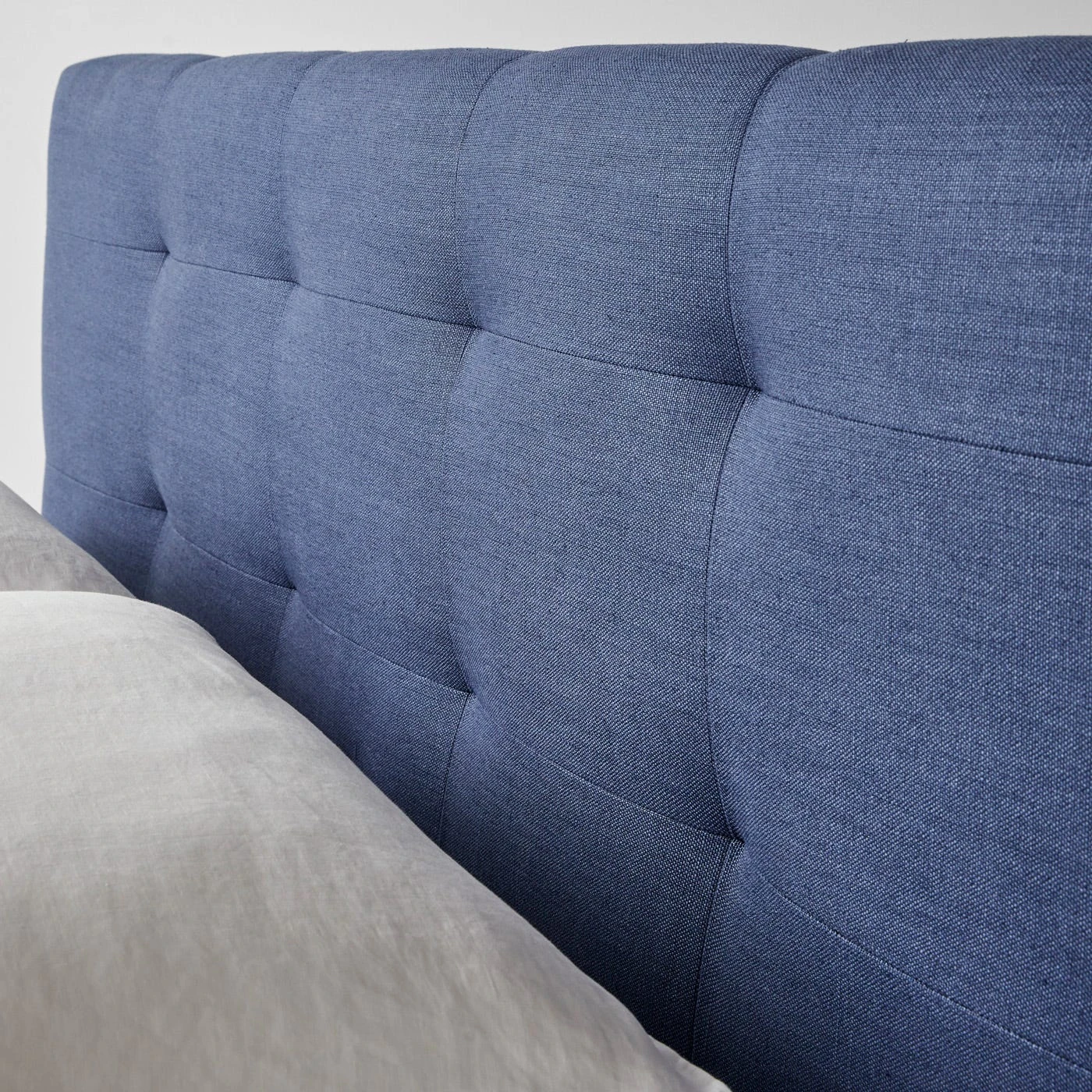 Make a remarkable choice for your bedroom without worrying about overwhelming your space. Constructed in the USA, this navy platform bed is covered in 100% European flax linen fabric, bringing a subtle texture into a modern room. The hand-tufted headboard draws the eye in with its perfectly tailored appearance. Chrome legs take this navy linen bed to another level as the polished metal contrasts the slubby textured fabric. Create a sleeping sanctuary out of your bedroom with this linen navy bed.