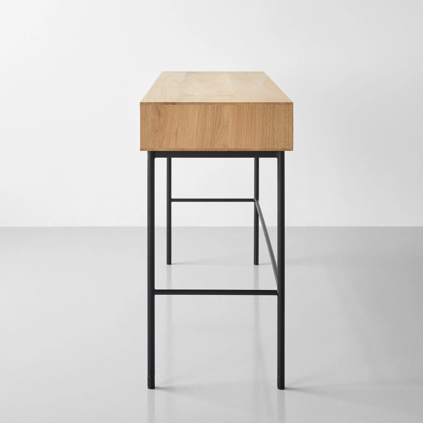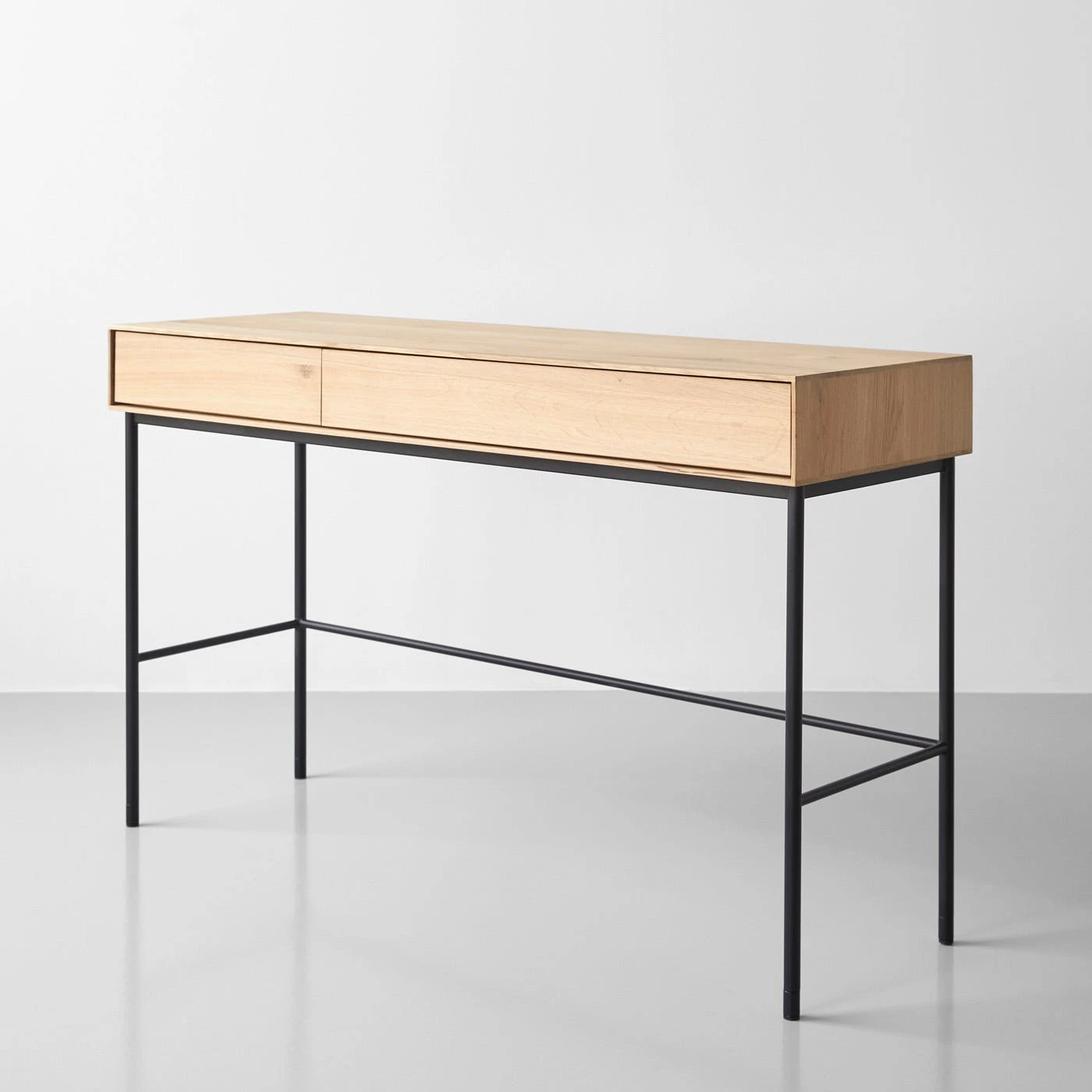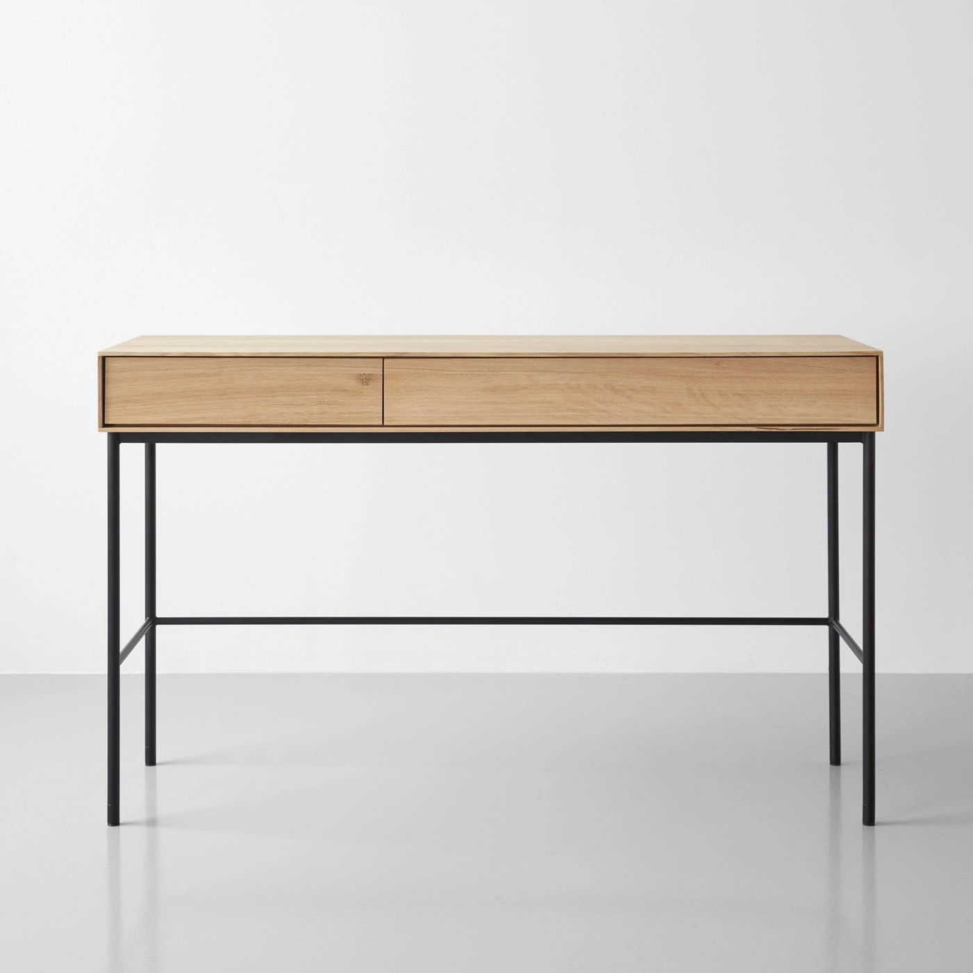 Simple design and clean lines combine in the Whitebird Writing Desk. This minimalist desk can go almost anywhere: hallways, entryways, offices and even behind your sofa. The solid white oak desk top and powder-coated steel legs create an effortlessly natural industrial feel. Two push-to-open drawers span the length of the desk, and the bonus of four adjustable legs means your desk is always level. Getting work done is easier with a well designed writing desk to utilize.