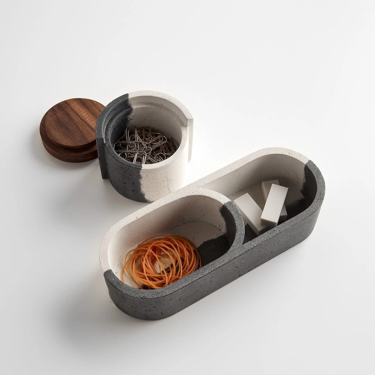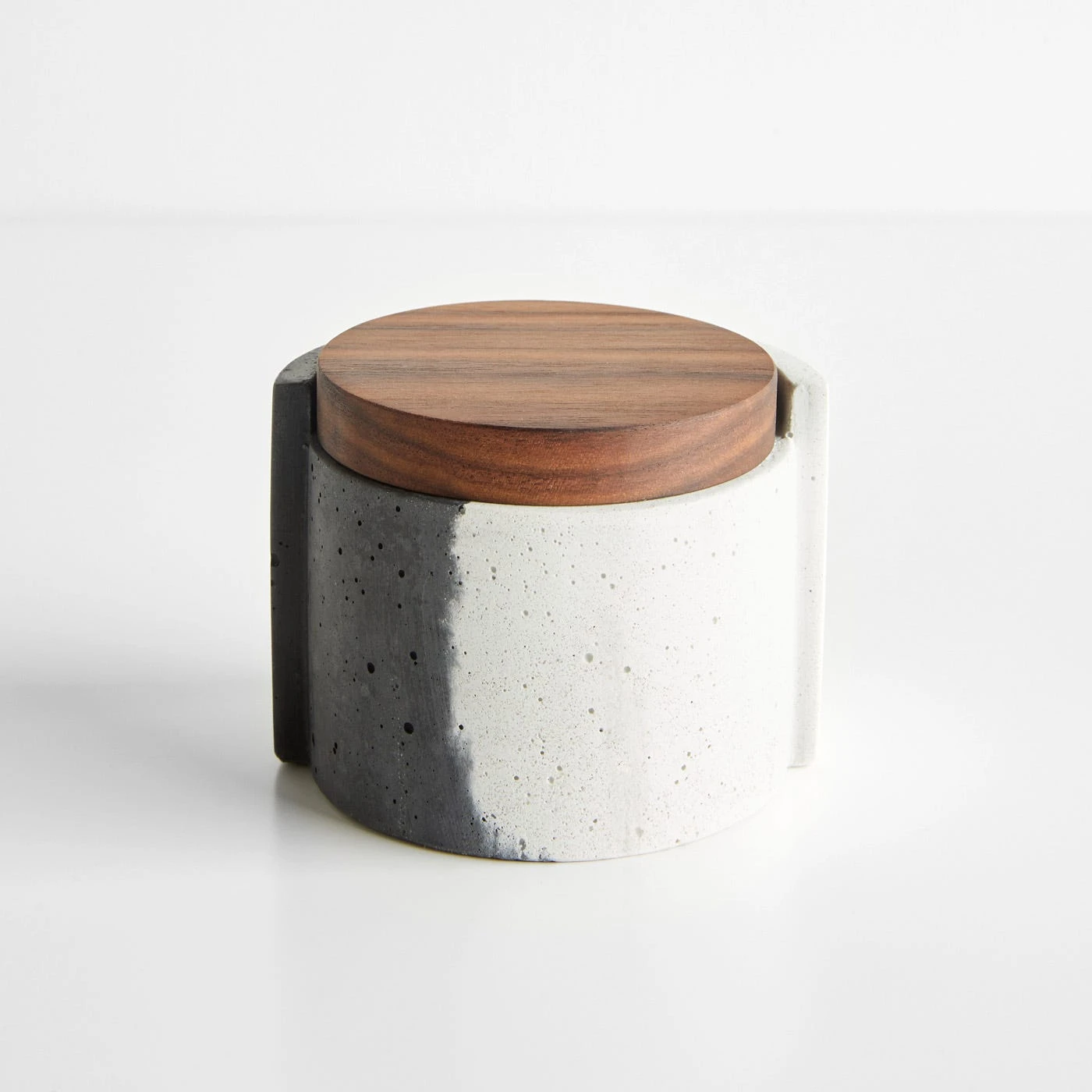 Convenience doesn’t have to be boring. This eye-catching piece is perfect for any room in the house. And don’t bother putting it away — as artistic as it is versatile, this piece is meant to be seen. Keep small items at your fingertips with this concrete container, perfect for use with sea salt, office supplies and more. This black and white dual-colored vessel features a beautiful walnut lid to stash your necessities out of view. Since this item is food safe, you can store your spices close at hand with this black and white layered container.